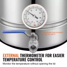 Made from high-quality stainless steel with a tri-ply bottom (featuring an aluminum core for enhanced heat distribution), this kettle ensures even heating and temperature stability throughout the brewing process. The included dual-scale thermometer allows for easy, accurate readings without lifting the lid, so you can maintain perfect conditions without disrupting your batch. And with the outward-facing ball valve, you’ll enjoy smooth, splash-free transfers every time.